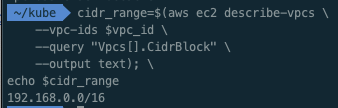 ㅇ 클러스터의 VPC에 대한 CIDR 범위를 검색하고 이후 단계에서 사용할 수 있도록 변수에 저장한다.