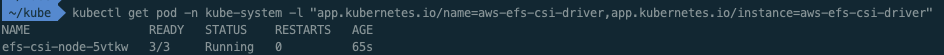 kubectl get pod -n kube-system -l "app.kubernetes.io/name=aws-efs-csi-driver,app.kubernetes.io/instance=aws-efs-csi-driver"