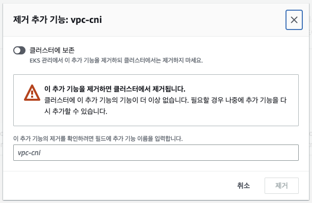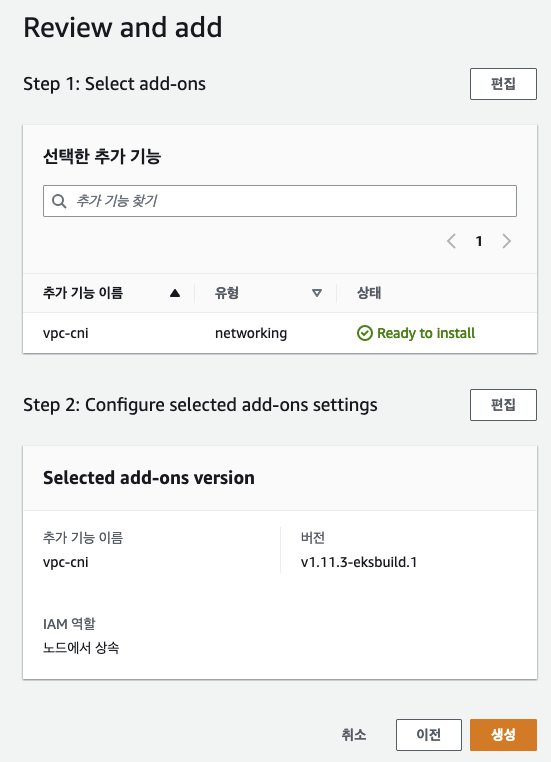 ㅇ 빠르게 진행하기 위해 AWS console에서 추가 기능을 추가하였다. 참고 Amazon VPC CNI plugin for Kubernetes 추가 기능 관리
