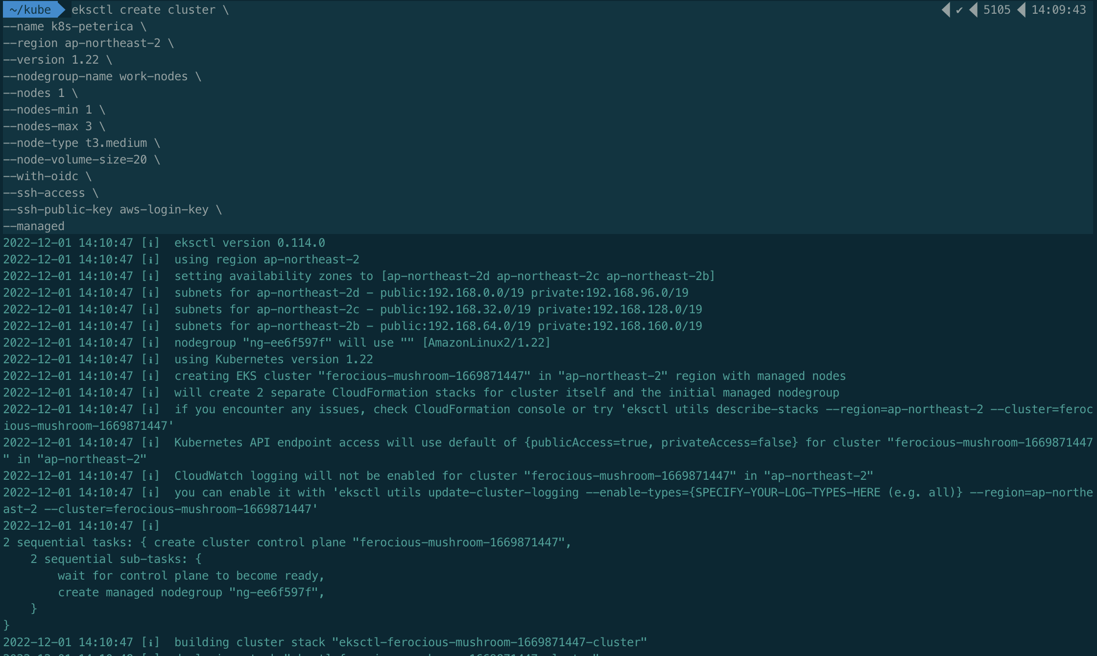 $ eksctl create cluster \ ✔ 5105 14:09:43