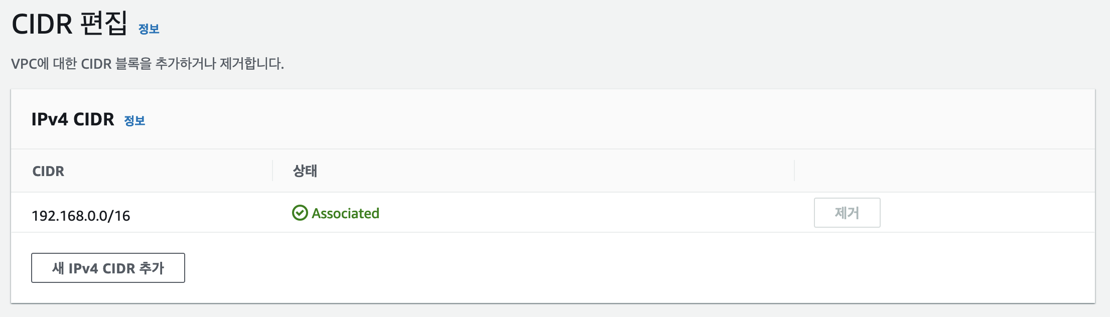 ㅇ 사용자 VPC를 선택 후 작업 > CIDR 편집을 클릭한다.