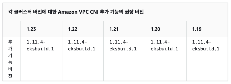 ㅇ EKS 클러스터 버전에 맞는 VPC CNI 버전의 정보이다.