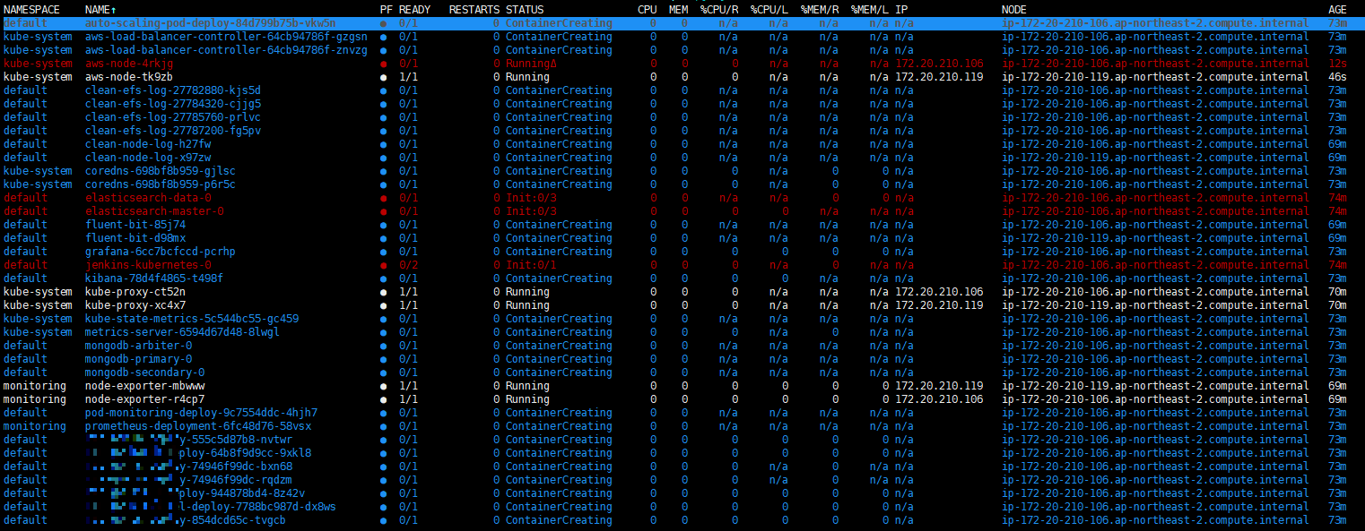 ㅇ 거의 모든 Pod들이 ContainerCreating 상태에서 바뀌지 않고 교착상태에 빠져 있었다.