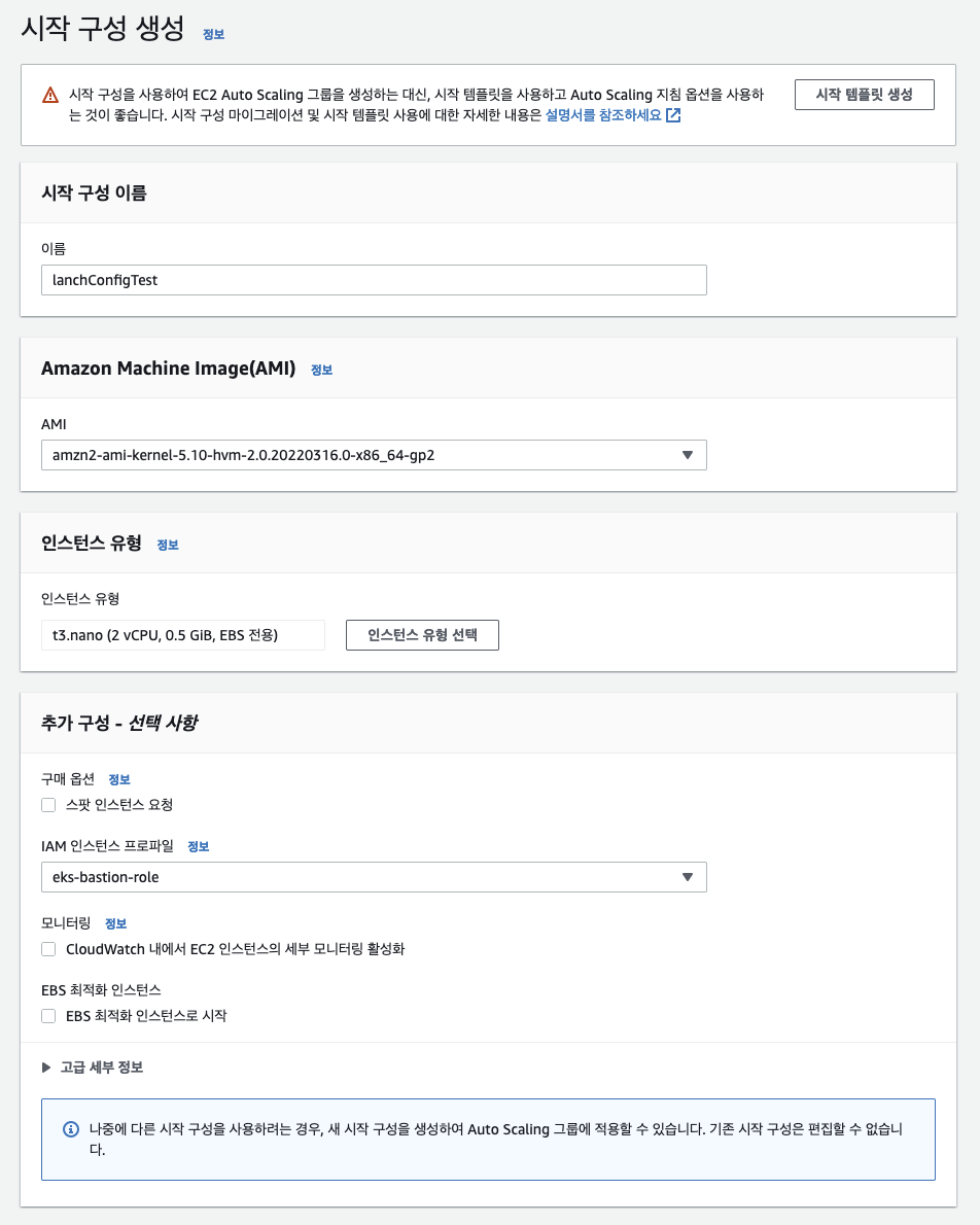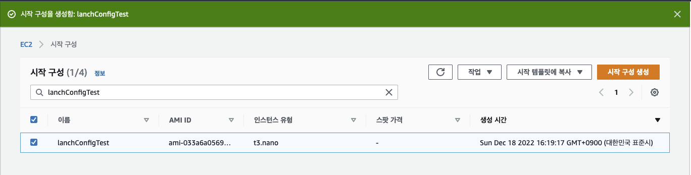 ㅇ AWS 시작구성 문서를 참조하여 테스트를 위한 lanchConfigTest 시작구성을 생성하였다.