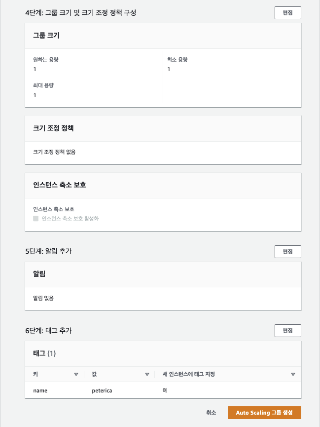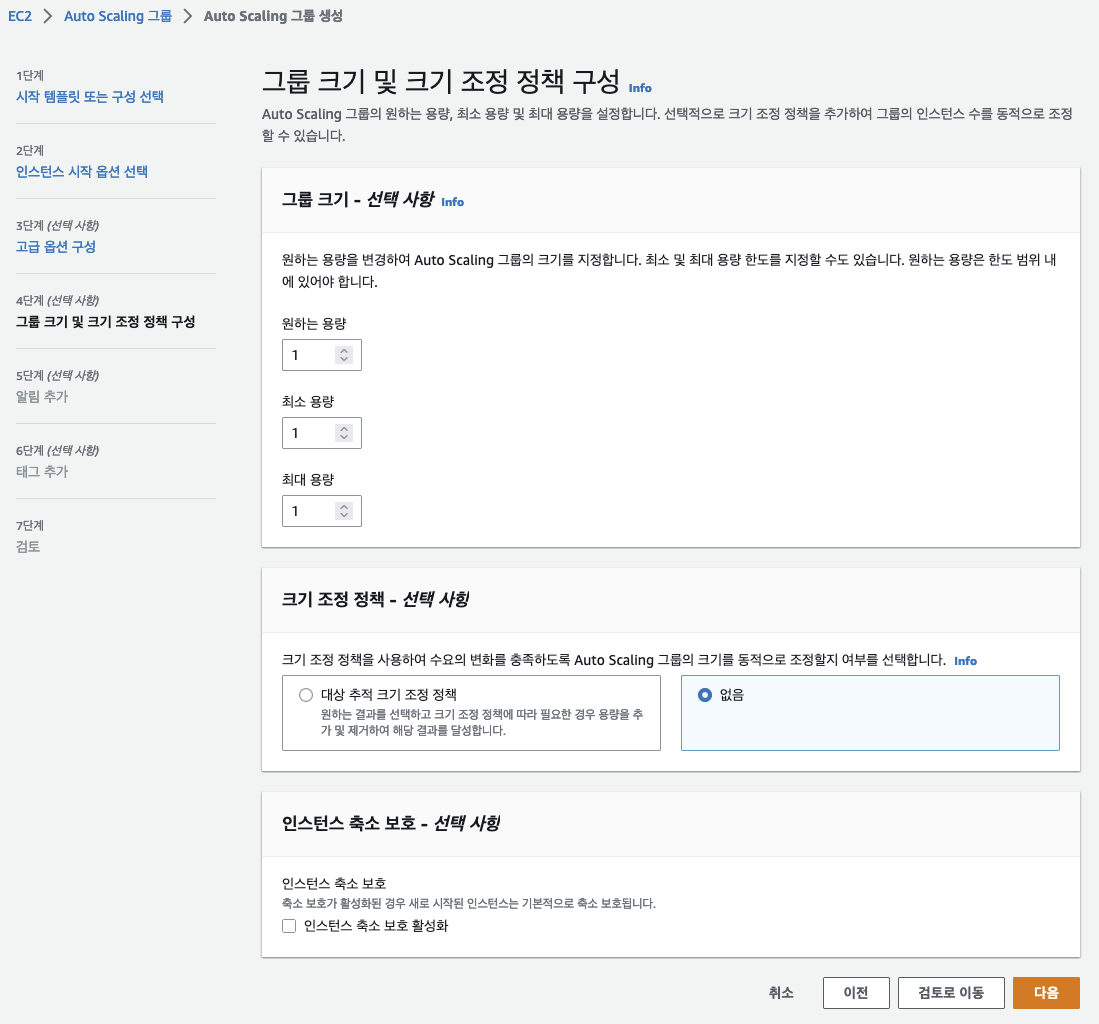 ㅇ 그룹 크기 및 조정 정책을 통해 aws scaling 그룹이 원하는 용량, 최소 최대 용량을 설정할 수 있다.