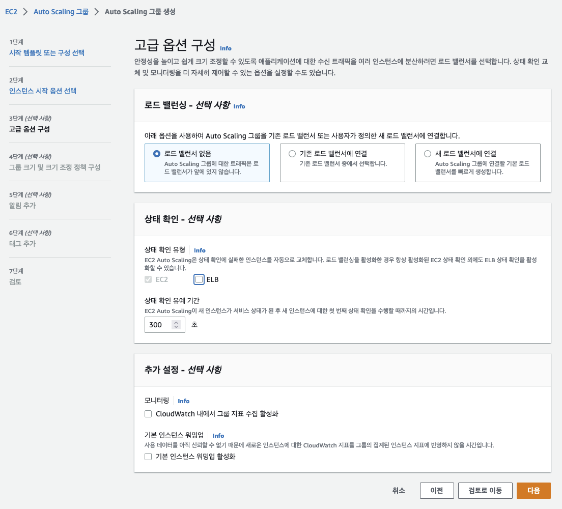 ㅇ 고급 옵션 구성에서는 인스턴스의 불안정 상태에 대한 복구 방법에 대해 정의하고 있다. 현재는 테스트가 목적이기 때문에 기본적인 내용을 변경하지 않고 다음을 클릭.