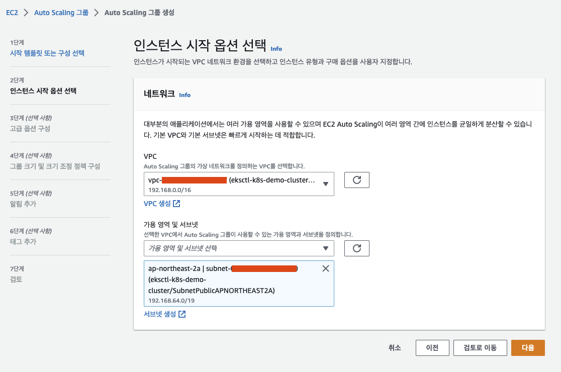 ㅇ 대부분의 애플리케이션에서는 여러 가용 영역을 사용할 수 있으며 EC2 Auto Scaling이 여러 영역 간에 인스턴스를 균일하게 분산할 수 있다. 기본 VPC와 기본 서브넷은 빠르게 시작하는 데 적합하다. 기존에 생성하였던 VPC와 가용 영역을 선택하였다. 두개 이상의 가용영역은 서로 다른 영역을 선택하여 장애에 대한 이중화를 전체 시스템 장애를 예방한다. 이번에는 테스트로 진행하기 때문에 1개의 가용영역만 선택한 상태이다.