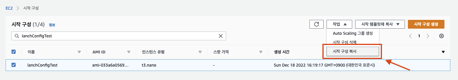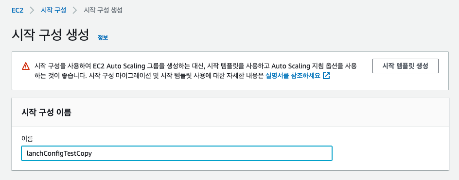 시작구성은 한번 생성된 것은 수정할 수 없다. 그래서 수정을 원한다면 신규로 시작구성을 생성해야한다. 그 과정은 수정을 위한 방법을 연습해보았다. 기존의 시작구성에서 조그만 변경되는 경우 시작구성 복사를 이용하면 간편하게 생성할 수 있다.
