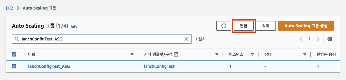 ㅇ EC2 > Auto Scaling 그룹으로 페이지를 이동한 후 수정할 ASG를 선택하여 편집을 클릭한다.
