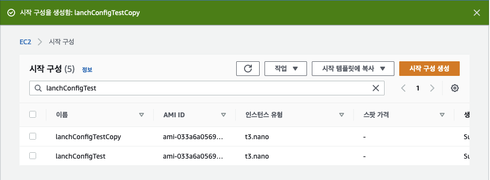 ㅇ 수정된 신규 시작구성 lanchConfigTestCopy가 생성되었다.