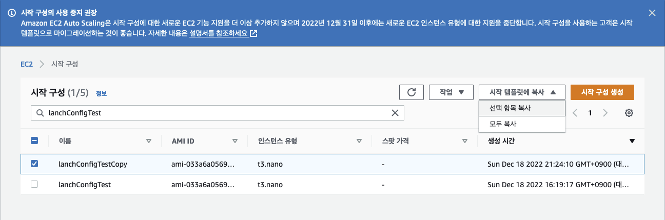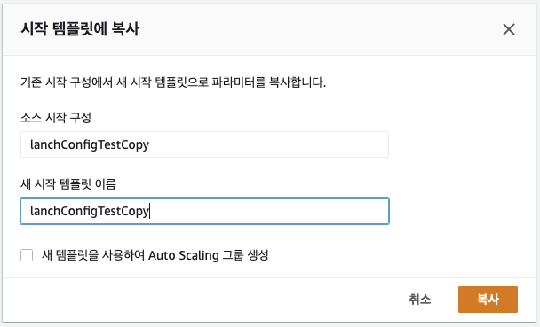 ㅇ Auto Scaling에서 시작 구성을 선택한 후에 선택 항목 복사를 클릭한다.