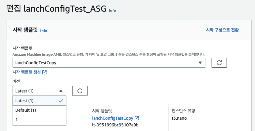 ㅇ 한 시작 템플릿을 여러 버전으로 만든 다음에는 오토 스케일링이 확장 시 시작 템플릿의 기본 버전을 사용할지 최신 버전을 사용할지 선택할 수 있다.