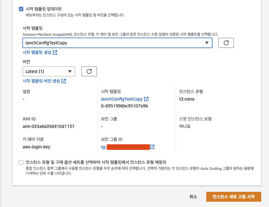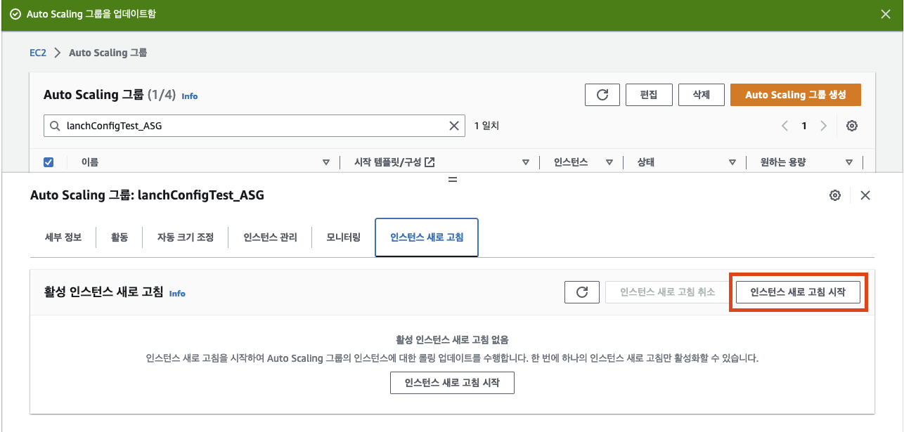 ㅇ 수정된 ASG를 선택하고 인스턴스 새로 고침을 클릭한다.