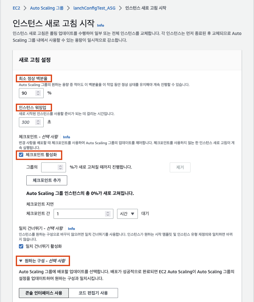 인스턴스 워밍업은 새 인스턴스의 상태가 InService로 변경된 시점부터 트래픽을 수신할 수 있는 시점까지의 기간이다. 인스턴스 새로 고침 중 Amazon EC2 Auto Scaling은 새로 시작된 인스턴스가 정상임을 확인한 후에 즉시 다음 대체로 이동하지 않는다. 다른 인스턴스 대체로 진행하기 전에 지정한 워밍업 기간에 대기한다. 이는 쿠버네티스 환경에서 WorkNode가 생성되고, 컨테이너가 올라가는 시간을 확보할 수 있는 설정이 될 수 있다.
