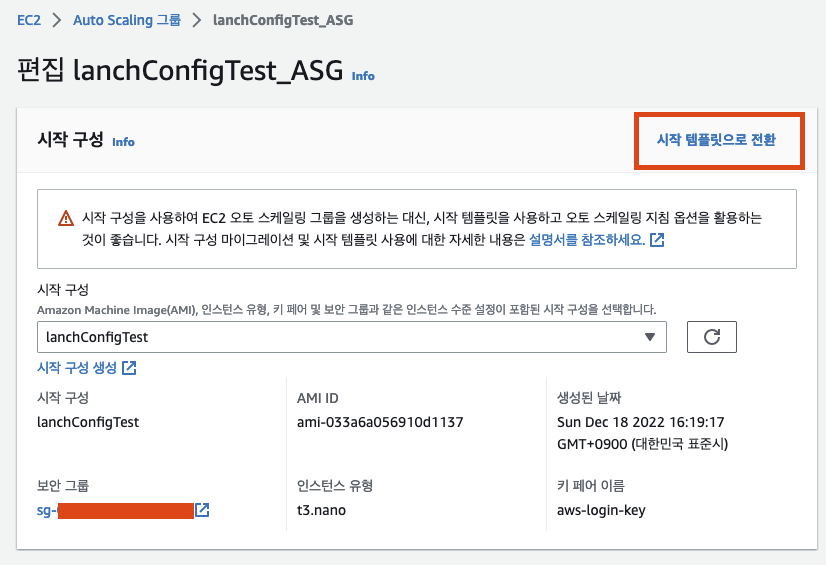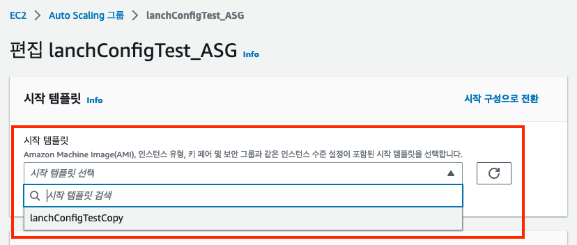 기존의 시작 구성이 있는 오토 스케일링을 편집할 경우, 시작 구성을 시작 템플릿으로 대체할 수 있다. 이 옵션을 사용하면 현재 사용하고 있는 오토 스케일링에 시작 템플릿을 사용할 수 있다. 이렇게 함으로써 시작 템플릿의 버전 관리 및 기타 기능을 활용할 수 있다.