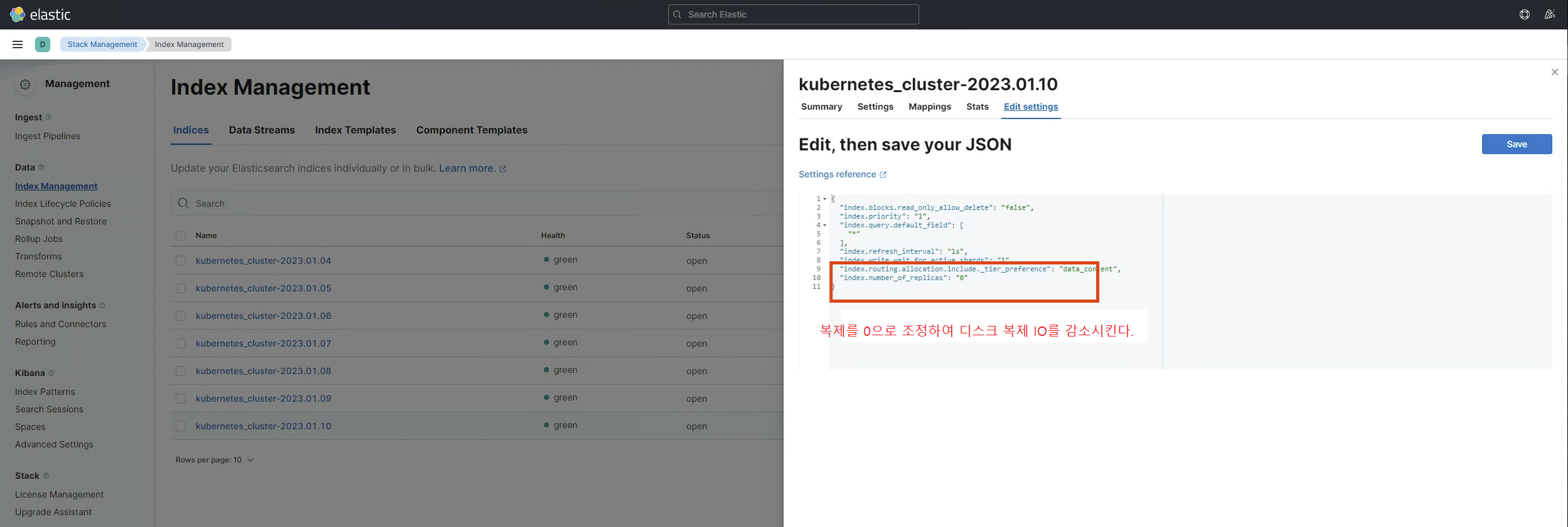 ㅇ 오늘자 Indices를 선택하여 replicas를 0으로 수정하였다.