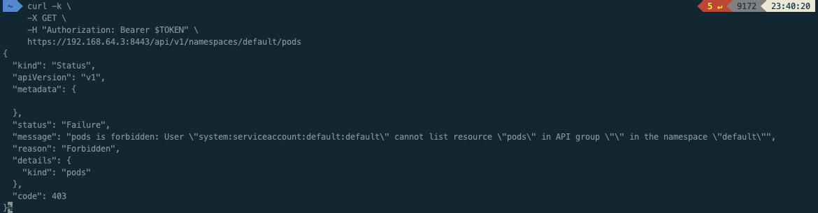 "message": "pods is forbidden: User \"system:serviceaccount:default:default\" cannot list resource \"pods\" in API group \"\" in the namespace \"default\"",