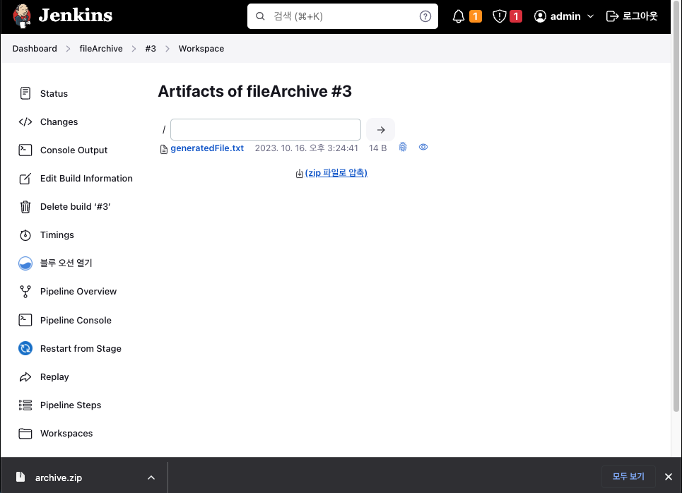 archiveArtifacts artifacts: 'generatedFile.txt', # 싱글파일