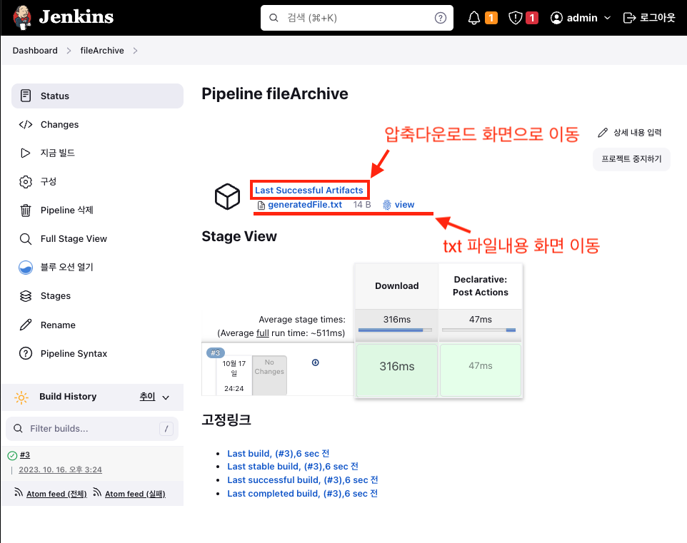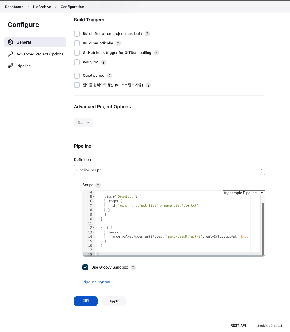 ㅇ Pipeline에 간단하게 파일을 생성하고 다운로드 하는 Script를 작성하였습니다.