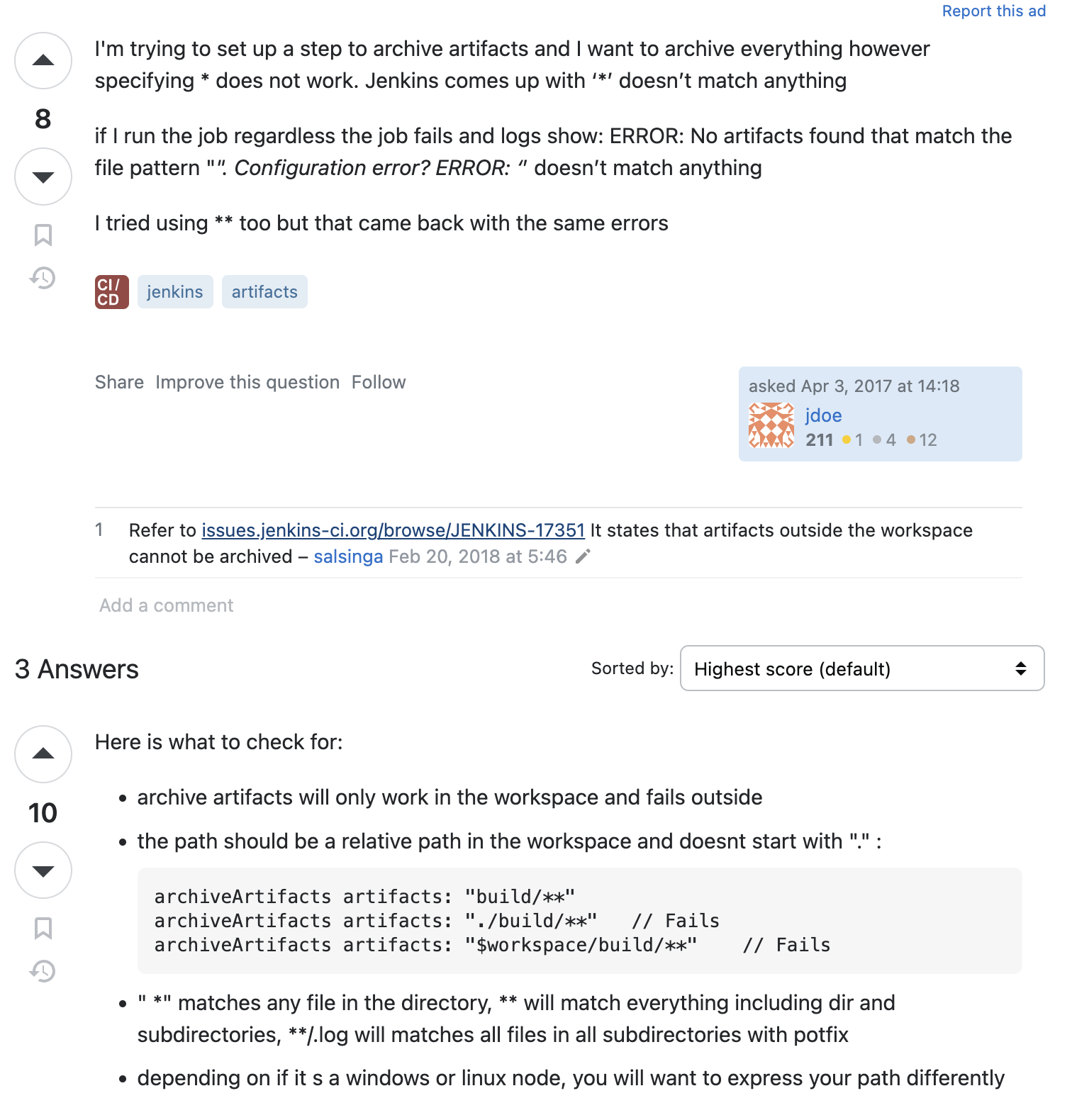 archiveArtifacts artifacts: "$workspace/build/**" // Fails
