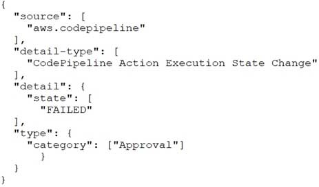 한 회사에서 테스트 프로세스를 자동화하기 위해 AWS CodePipeline을 구현하고 있습니다.회사는 실행 상태가 실패하고 Amazon CloudWatch에서 다음 사용자 지정 이벤트 패턴을 사용할 때 알림을 받기를 원합니다.