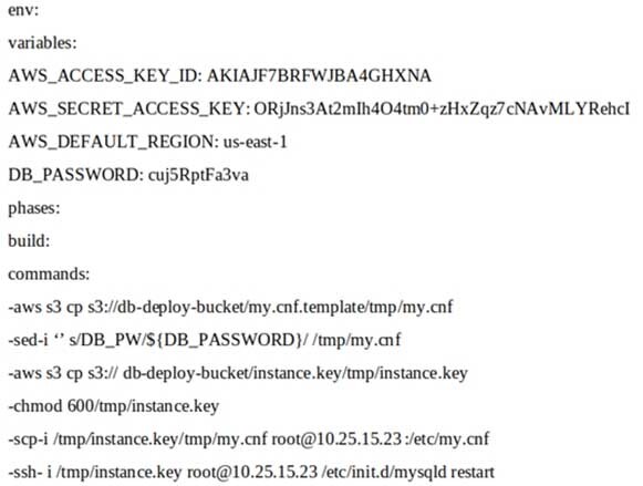 DevOps 엔지니어가 Amazon Linux에서 호스팅되고 보안 검토에 실패한 프로젝트에서 작업하고 있습니다.DevOps 관리자는 AWS CodeBuild 프로젝트에 대한 회사 buildspec.yaml 파일을 검토하고 권장 사항을 제공하라는 요청을 받았습니다.buildspec.yaml 파일은 다음과 같이 구성됩니다.