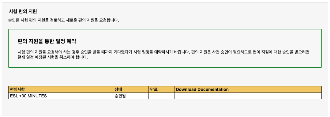 - 시험 일정을 예약하기 전에 시험 편의 지원을 요청합니다. 여기에는 영어가 모국어가 아닌 사용자를 위한 추가 시험 시간이 포함됩니다.