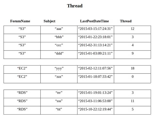 Subject를 기본 키로 사용하고 ForumName을 정렬 키로 사용합니다.LSI with Thread를 정렬 키로 사용하고 LastPostDateTime에 대한 가져오기 작업을 수행합니다.
