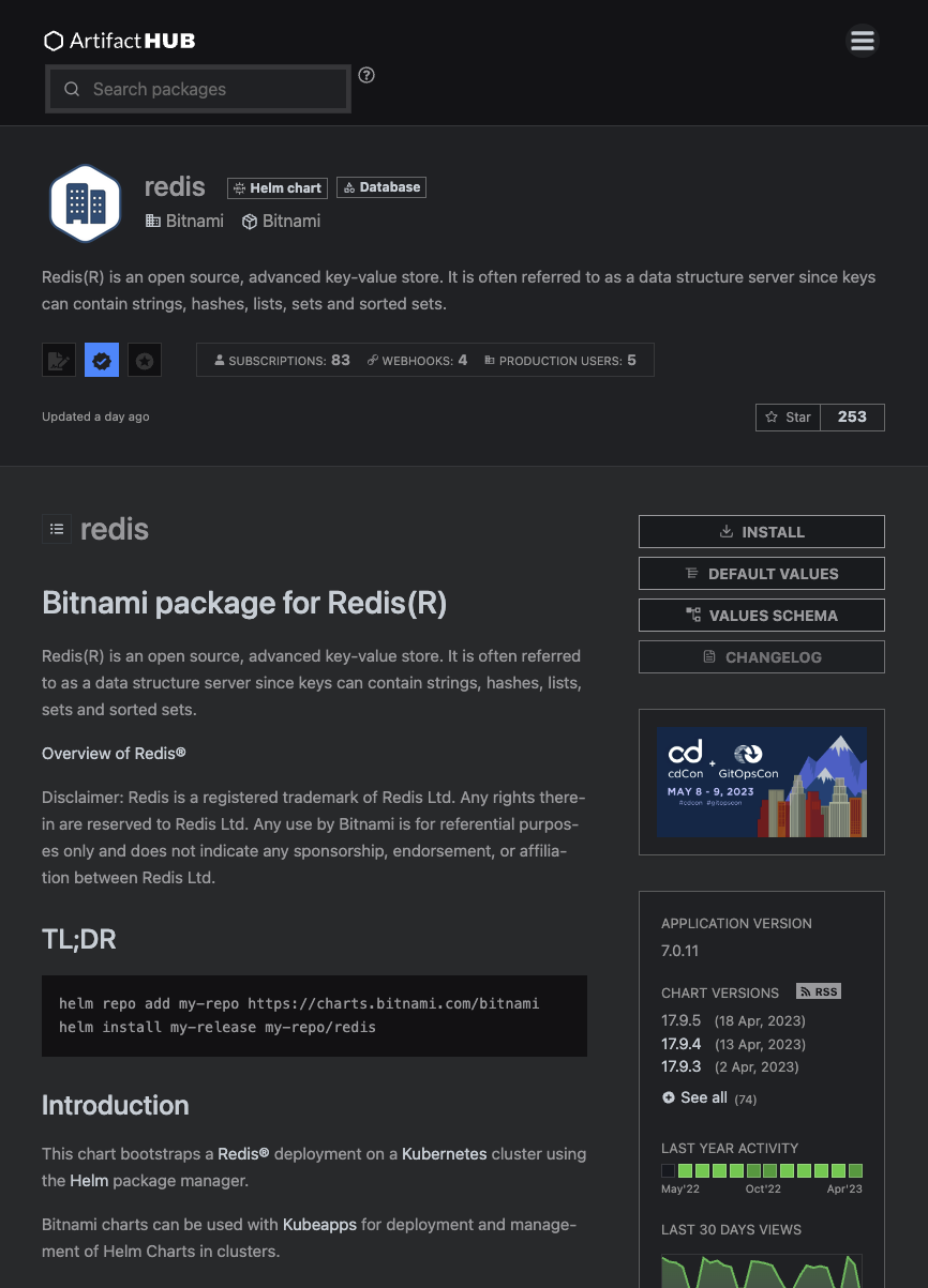 ㅇ redis 설치를 위한 Helm chart의 목록을 순위별로 확인 할 수 있다.