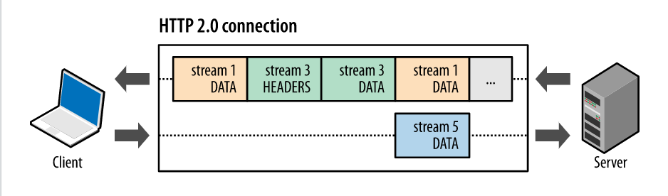 기존의 요청메세지를 작은 프레임으로 쪼개, 하나의 논리적인 스트림(요청하고 응답하는 하나의 데이터 양방향 흐름)을 여러개의 프레임으로 분리 시켰다. 위 그림에서 스트림 1,3,5 총 3개의 스트림이 동시에 병렬적으로 하나의 연결안에서 이루어지는 것을 알 수 있다. 이로써 응답 다중화 (멀티플렉싱)을 가능하게 하고 위에서 언급 되었던 HOL block 문제를 해결 할 수 있다.