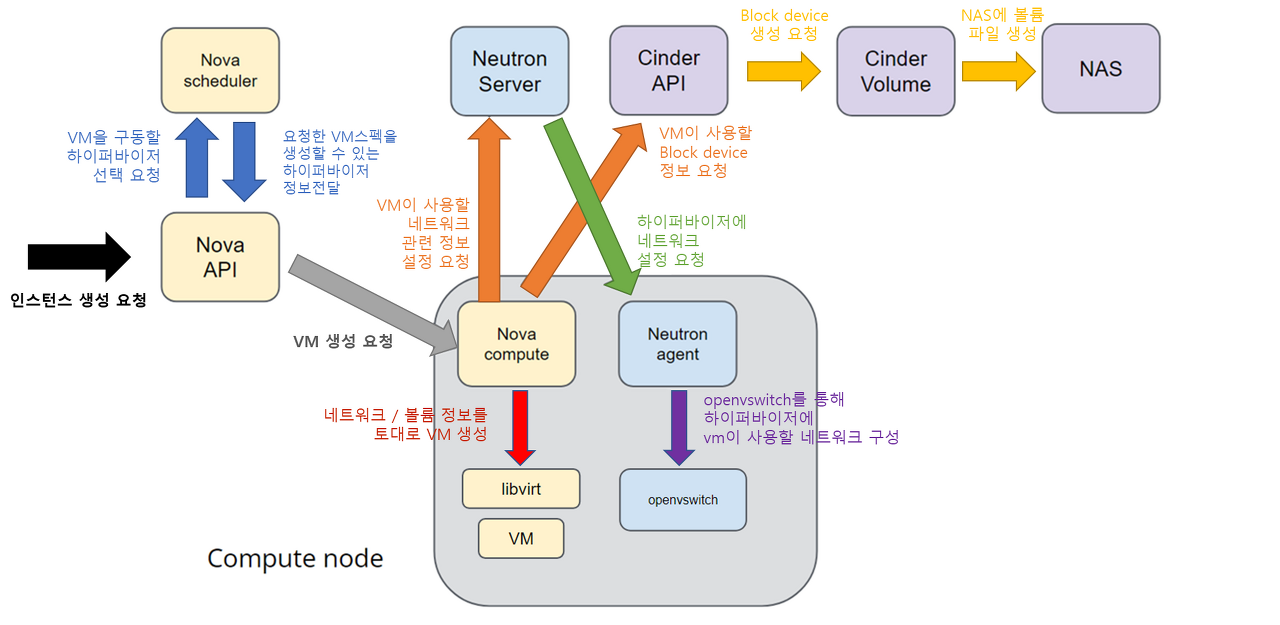 (nova-api가 인스턴스 생성 요청을 받으면, nova-compute(agent)가 vm을 만든다)