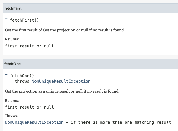 ㅇ QueryDSL을 사용하다 보면 fetchFirst()와 fetchOne() 메서드를 자주 마주치게 된다.
