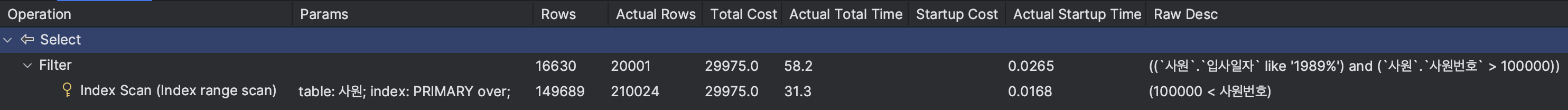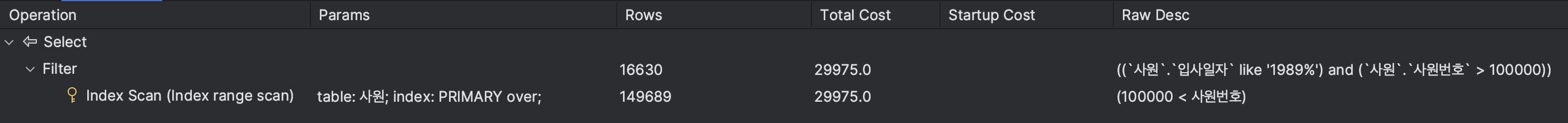 ㅇ (tree) 사원 테이블의 PRIMARY 인덱스를 스캔한 후(149689건)