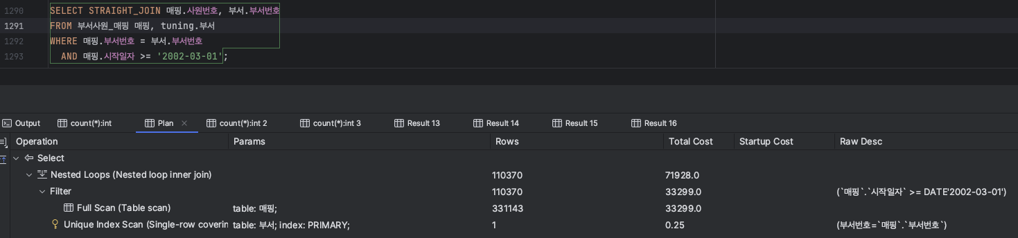 ㅇ 부서(드라이브 테이블)와 매핑 테이블(드리븐 테이블)이 먼저 조인이 이루어져 331603건에서 시작일자로 필터되고 있다.