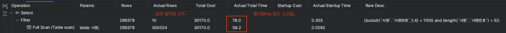 ㅇ Actual Rows에서 Full Table scan 300024건과 필터된 10건을 표시하고 개별 단계에서 Actual Total Time을 보여주고 있다.