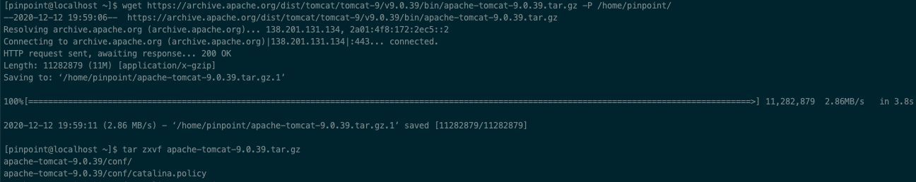 wget https://archive.apache.org/dist/tomcat/tomcat-9/v9.0.39/bin/apache-tomcat-9.0.39.tar.gz -P /home/pinpoint/