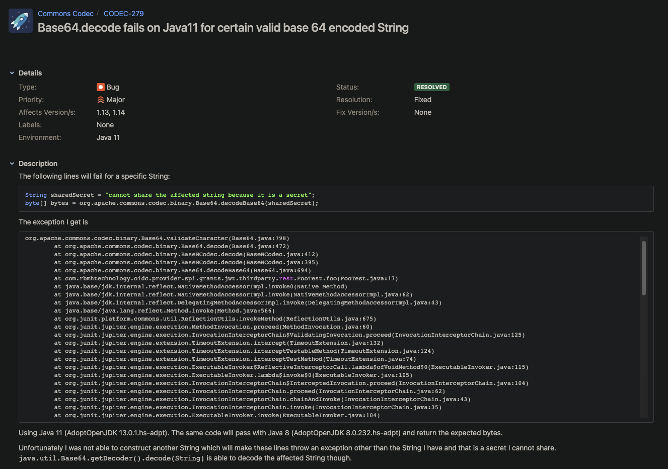 ㅇ Decode를 위한 동일한 공통 코드 버전이 Java 8에서는 잘 작동하지만 Java 11에서는 실패하고 있다.