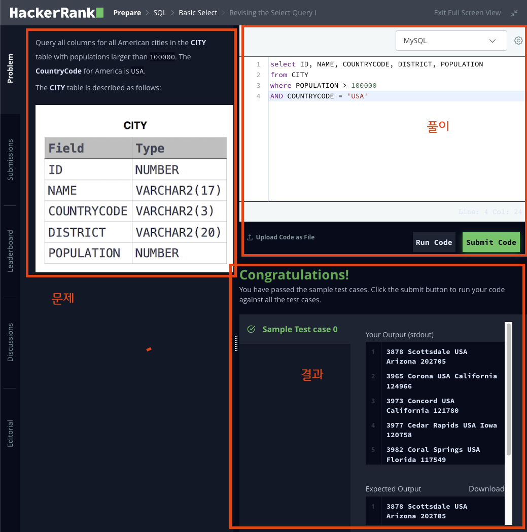 ㅇ 문제에 대한 설명이 있고, 문제 풀이를 위한 SQL에디터가 있다.
