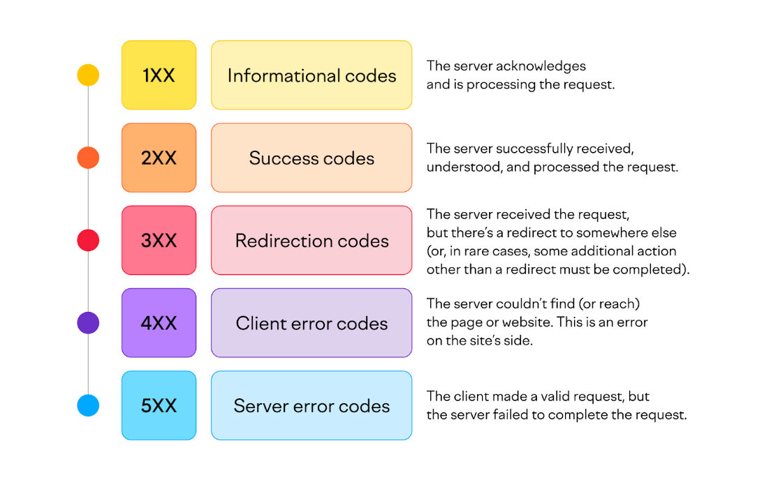 Http Status Code는 크게 다섯 가지 HTTP 상태 코드 범주(또는 클래스)가 있다. 각각은 서버에서 브라우저로의 다른 응답을 나타낸다.
