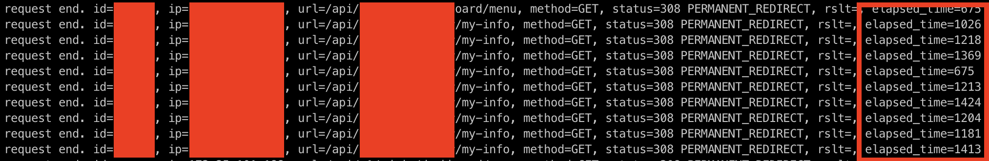 Gateway trace 로그에서 308 영구 리다이렉션이 지속적으로 발생하였다. 무한 리다이렉션으로 인해 처리속도(elapsed_time)이 1초 이상 소요되는 상황이 발생하였다.