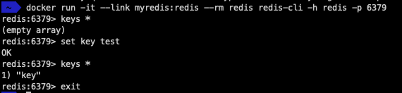 $ docker run -it --link myredis:redis --rm redis redis-cli -h redis -p 6379 ✔ 6241 11:11:25