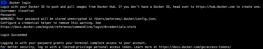 WARNING! Your password will be stored unencrypted in /Users/peterseo/.docker/config.json.