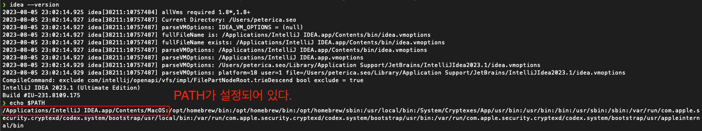 ㅇ 터미널을 실행하면 idea version과 path를 확인할 수 있고 idea를 터미널에서 바로 실행할 수 있게 되었습니다.