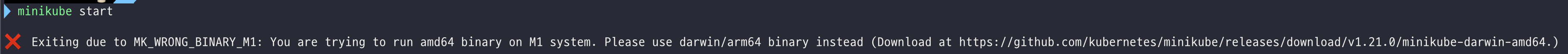 ❌ Exiting due to MK_WRONG_BINARY_M1: You are trying to run amd64 binary on M1 system. Please use darwin/arm64 binary instead (Download at https://github.com/kubernetes/minikube/releases/download/v1.21.0/minikube-darwin-amd64.)