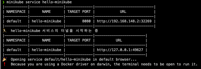 🏃 hello-minikube 서비스의 터널을 시작하는 중