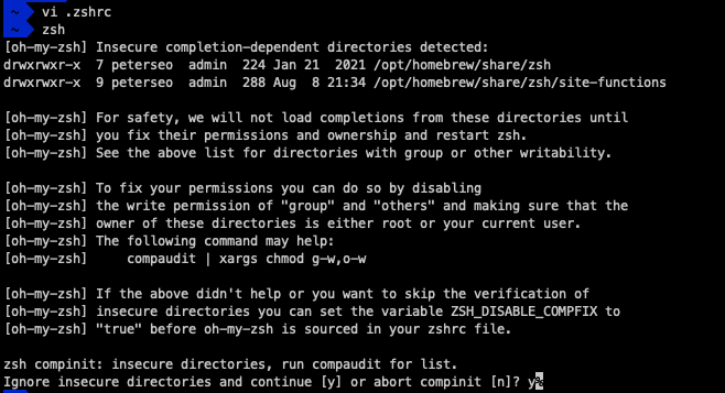 Ignore insecure directories and continue [y] or abort compinit [n]? y%