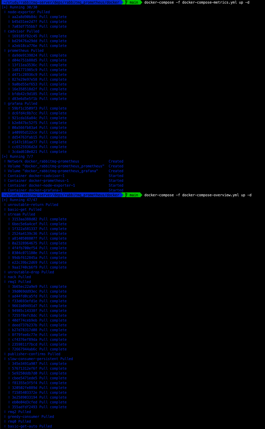 ㅇ Docker Compose 매니페스트를 사용하여 사전 구성된 RabbitMQ 클러스터, Prometheus 인스턴스 및 RabbitMQ 개요 대시보드에 표시되는 메트릭을 생성하는 기본 워크로드를 실행합니다.