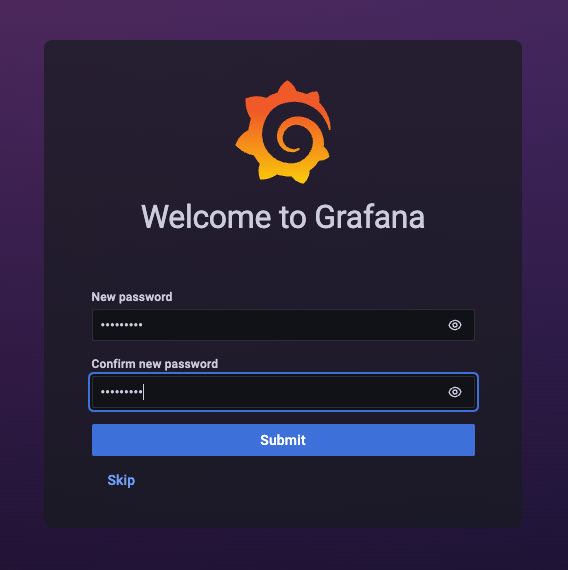 ㅇ 첫 번째 로그인에서 Grafana는 비밀번호 변경을 제안합니다. 이 단계에서 Skip으로 건너뛸 수 있습니다.