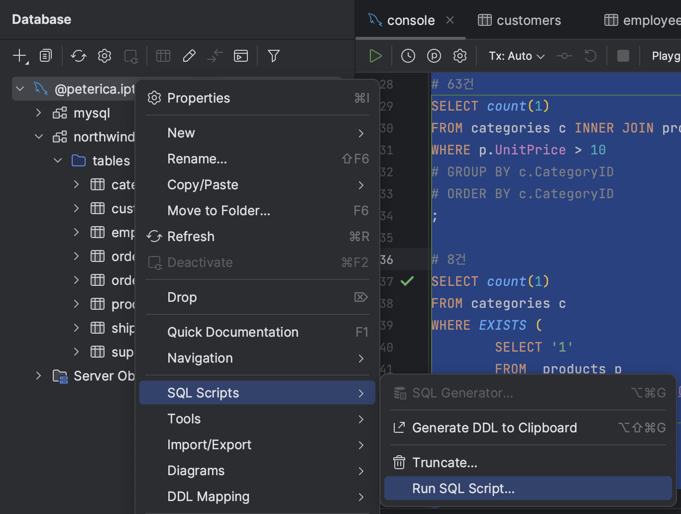 ㅇ Intellij에서 MySQL DB를 선택하고 SQL Scripts > Run SQL Script... 를 선택합니다.