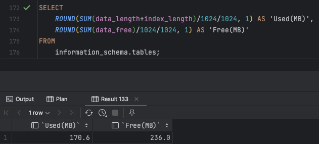 ROUND(SUM(data_length+index_length)/1024/1024, 1) AS 'Used(MB)',